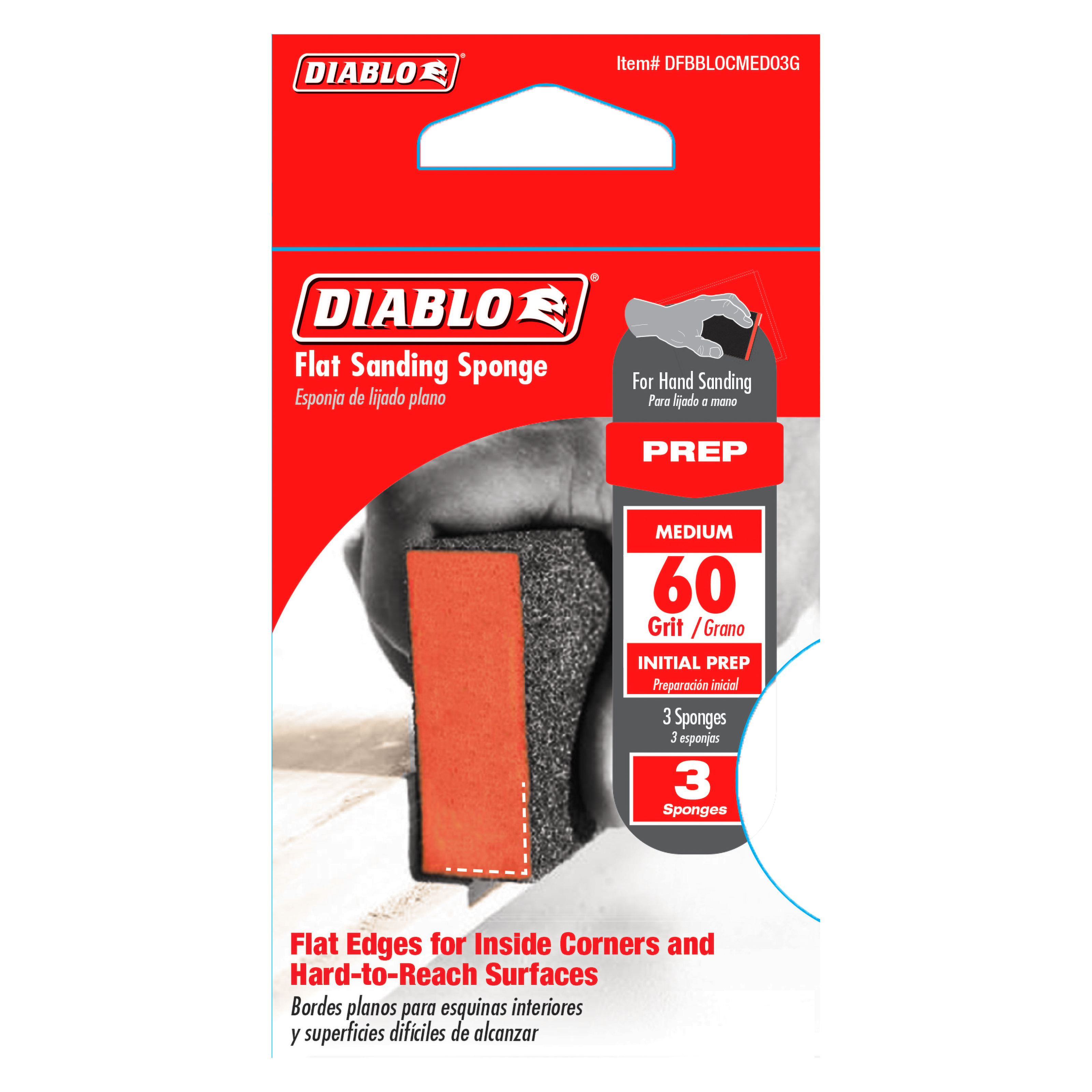 Diablo's premium flat edge sanding sponges include break-through innovations for superior sanding performance, extended sanding life and increased hand-sanding productivity. Featuring a premium aluminum oxide blend, these flat sanding sponges remove material faster and offer up to 3X longer sanding life versus standard hand sanding sheets. The flat edges make it easy to access inside corners and hard to reach surfaces. The full contact design provides maximum sanding potential by delivering consistent scratch patterns and ultra-smooth finishes. The superior grain bonding system, ENDURA-BOND™, provides Diablo's sanding blocks with longer life and extreme durability.
