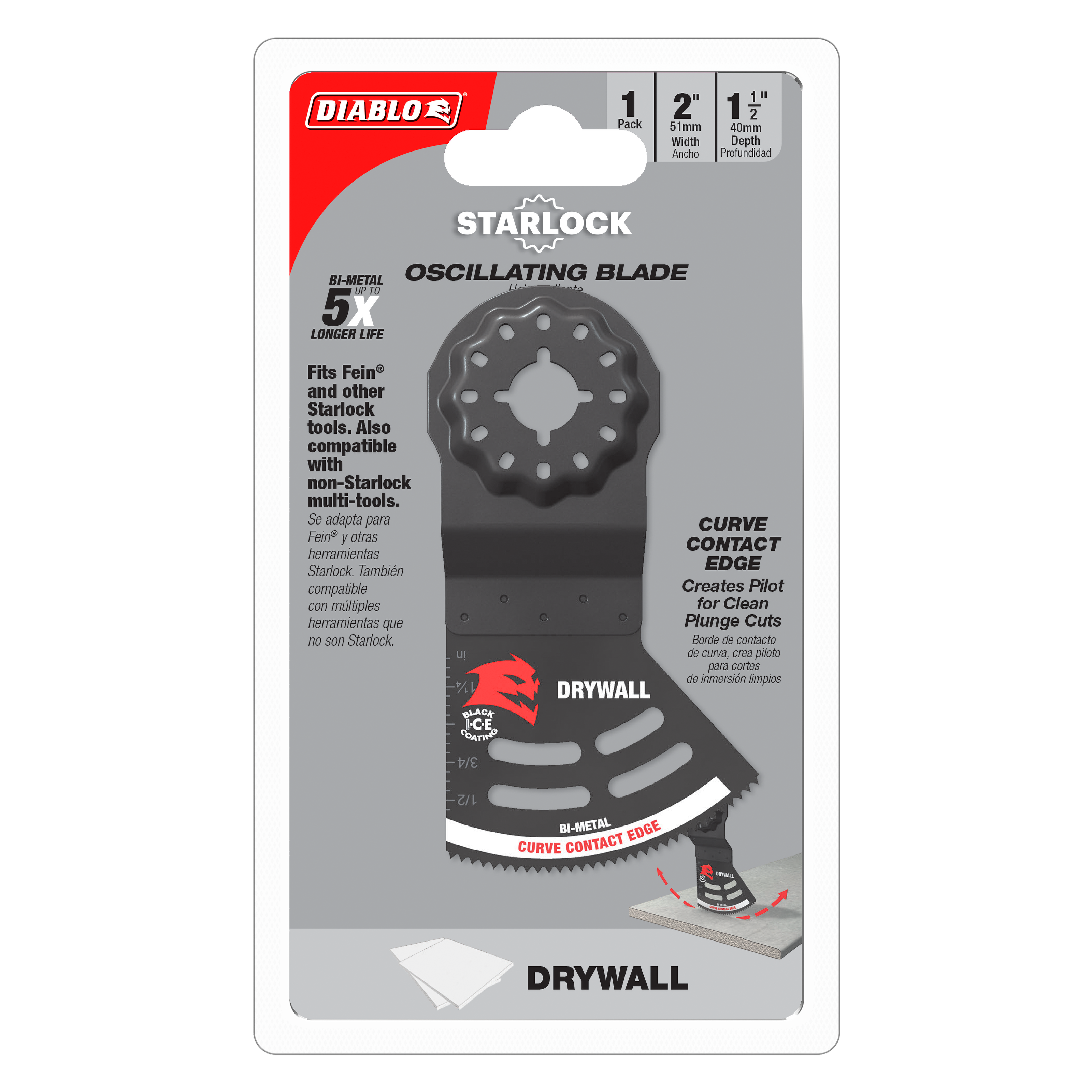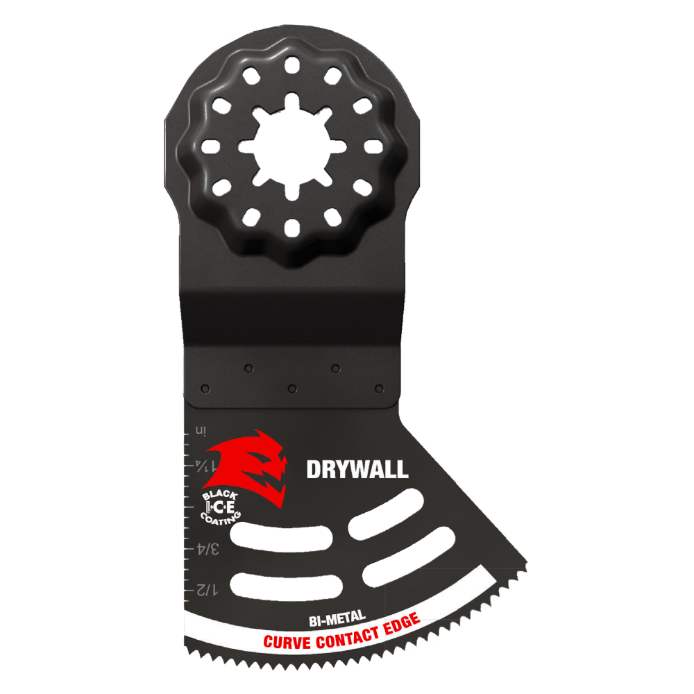 Diablo’s Starlock bi-metal oscillating blades feature application specific designs that deliver maximum durability and longer life drywall applications. These high-performance blades feature an ultra-hardened cutting edge to deliver up to 5X longer life than standard blades. Curve contact edge creates a pilot for precise, clean plunge cuts with less vibration. Black I.C.E. (Industrial Cooling Element) keeps the teeth cool and build up free for fast, clean cuts. Tool free quick-change interface fits Fein and other Starlock tools; also compatible with most non-Starlock multi-tools.