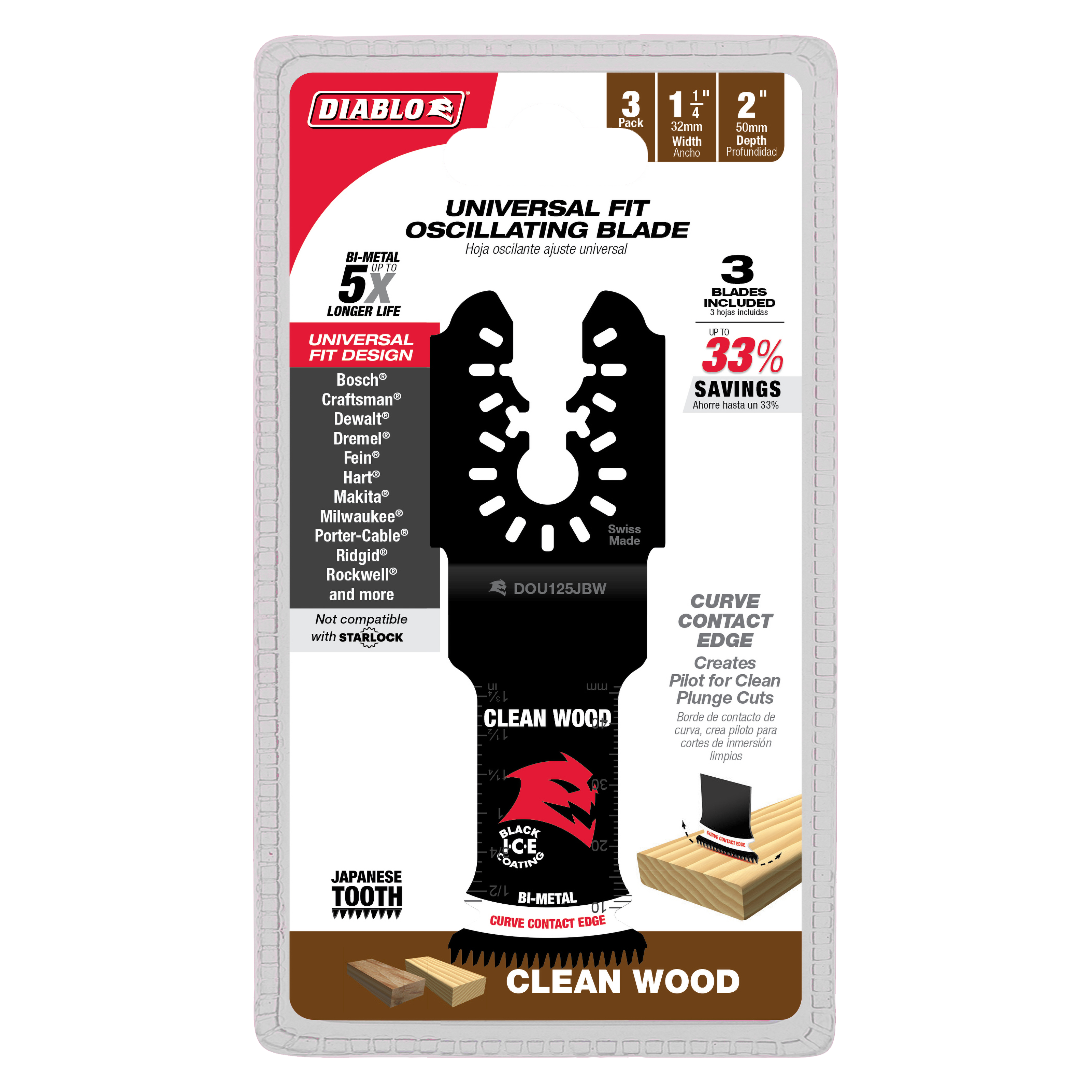 Diablo’s universal fit bi-metal oscillating blades feature application specific designs that deliver maximum durability and longer life in clean wood applications. These high-performance blades feature an ultra-hardened cutting edge to deliver up to 5X longer life than standard blades. Curve contact edge creates a pilot for precise, clean plunge cuts with less vibration. An optimized Japanese tooth design and Black I.C.E. (Industrial Cooling Element) keeps the teeth cool and build up free for fast, clean cuts. The blade’s universal fit, adapter-free design easily attaches most tools, with the exception of Starlock tools.
